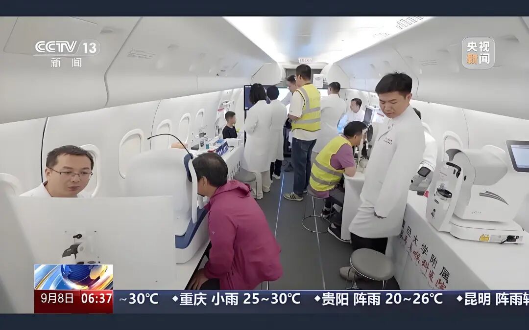 这个特殊的空中医院—“五官健康C909飞机医院”,它是集成了移动诊室-综合检查-培训实操-5G远程会诊等功能于一体的空中移动医疗平台。这架国产飞机首次搭载了由我国自主研发的具有国际先进水平的诊疗设备,49名患者在家门口飞机上体验到了先进的、一站式的诊疗流程。